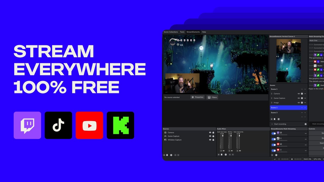 • Stream to unlimited platforms for 100% free, including Twitch, TikTok, YouTube, X, KICK, Trovo, and custom RTMP outputs like Instagram.