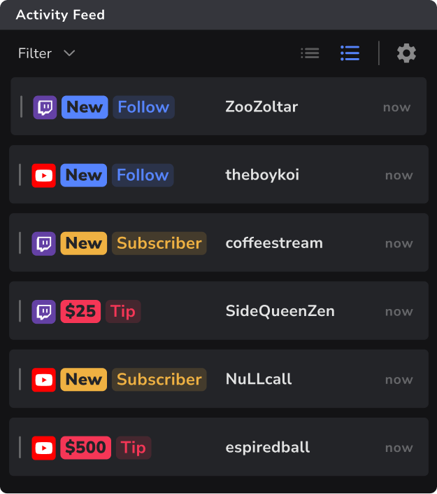 • Track follows, subs, tips, memberships, and more from all platforms in one spot.
