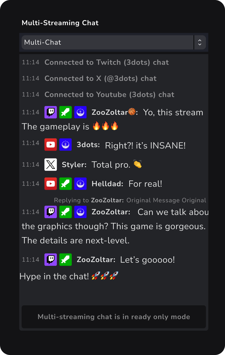 • See your chat from Twitch, YouTube, X, and KICK (more platforms coming!) all in one easy-to-read feed